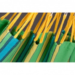 Hamac double Currambera, un mélange de rayures traditionnelles et joyeuses. En pur coton de qualité supérieure, il est fabriqué en Colombie. Les nombreux cordons de suspension permettent une répartition du poids optimale et ainsi assure confort de couchage et longévité du produit. Les lisières renforcées rendent le hamac indéchirable.