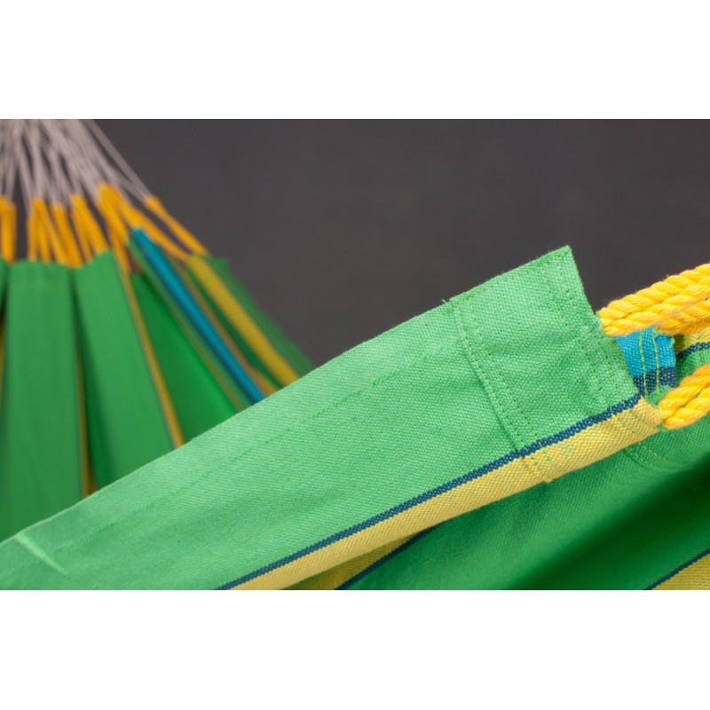 Les lisières sont renforcées par le doublement des fils de trame. Le tissu du hamac est de fait indéchirable.