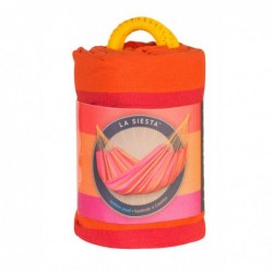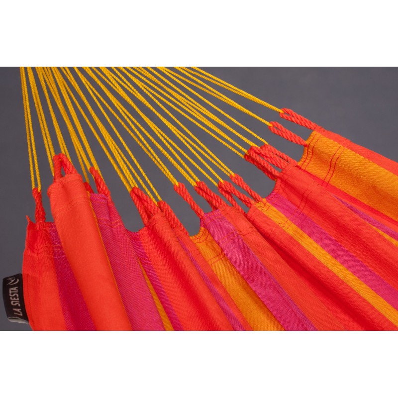 Hamac simple ultra résistant Sonrisa. Le havre de paix bien aimé de LA SIESTA, mélange de rayures vives et estivales. Il est fabriqué en Colombie à partir du tissu outdoor HamaTex® ce qui le rend ultrarésistant et garantit un séchage rapide. Les nombreux cordons de suspension permettent une répartition optimale du poids qui procure un grand confort et assure la longévité du produit. Les lisières renforcées rendent le hamac indéchirable.