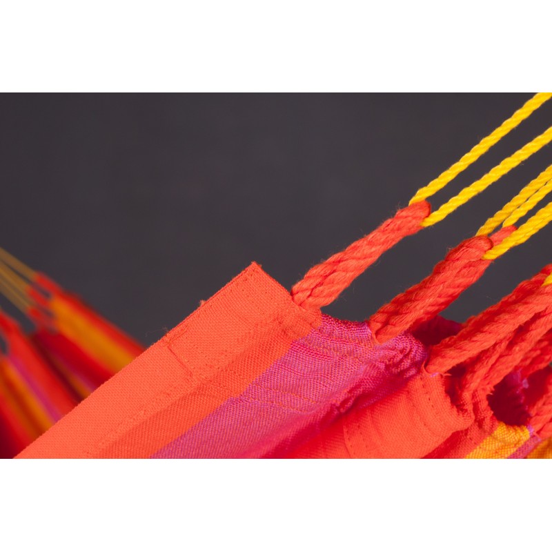 Les lisières sont renforcées par le doublement des fils de trame. Le tissu du hamac est de fait indéchirable.