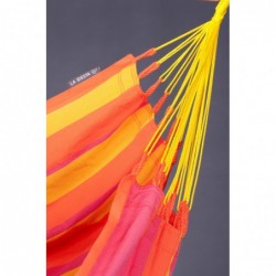 Hamac One simple ultra résistant Sonrisa. Le havre de paix bien aimé de LA SIESTA, mélange de rayures vives et estivales. Il est fabriqué en Colombie à partir du tissu outdoor HamaTex® ce qui le rend ultra résistant et garantit un séchage rapide. Les lisières sont renforcées, le hamac en est de fait indéchirable. Les nombreux cordons de suspension permettent une répartition du poids optimale et ainsi assure confort et longévité du produit. Le tourbillon intégré permet de pouvoir tourner à 360° en toute sécurité autour de l’axe de suspension. La barre d’écartement en bambou de très bonne qualité n’est pas seulement un délice pour les yeux, elle est aussi particulièrement solide et résistante aux intempéries. Le bois utilisé est issu de la gestion forestière responsable FSC.